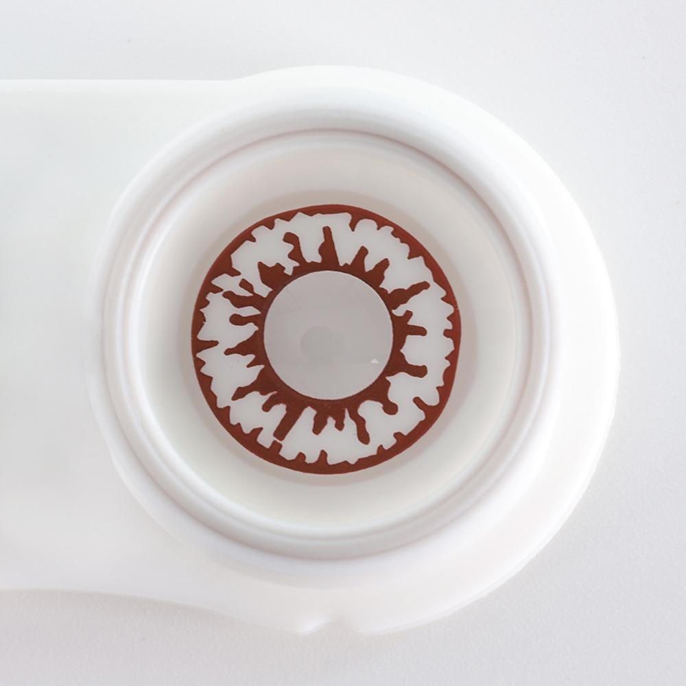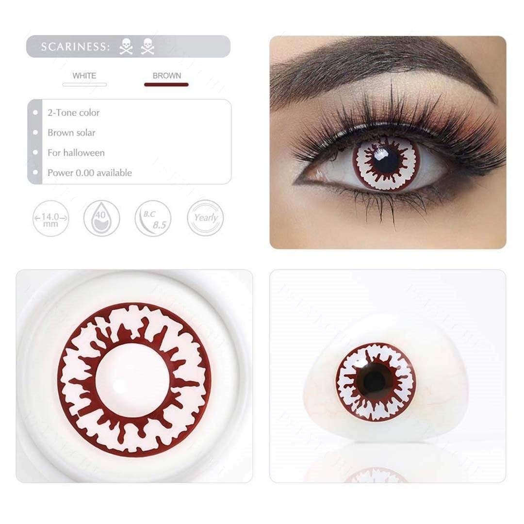The white background highlights the brown solar with the brown sprawling limbal ring They completely cover up your natural eye color and would look amazing with a Halloween costume. Bring the dramatic solar into your eyes to make you stand out among your friends.
