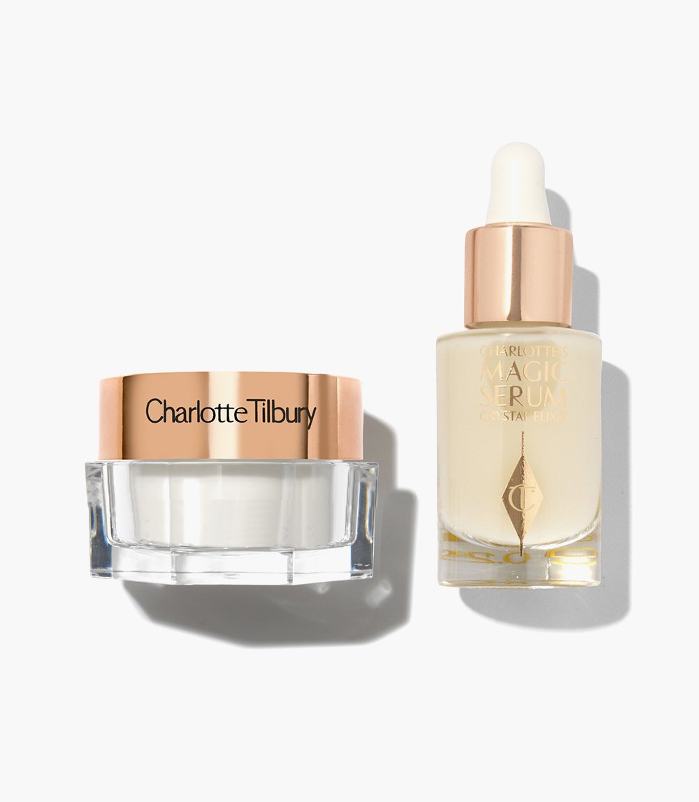 Discover the secret to a glowing skin with the Charlotte Tilbury Charlotte’s Iconic Magic Skin Duo, a skin set featuring a moisturiser and serum to help leave a brighter more youthful look.