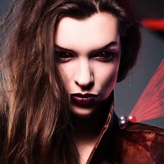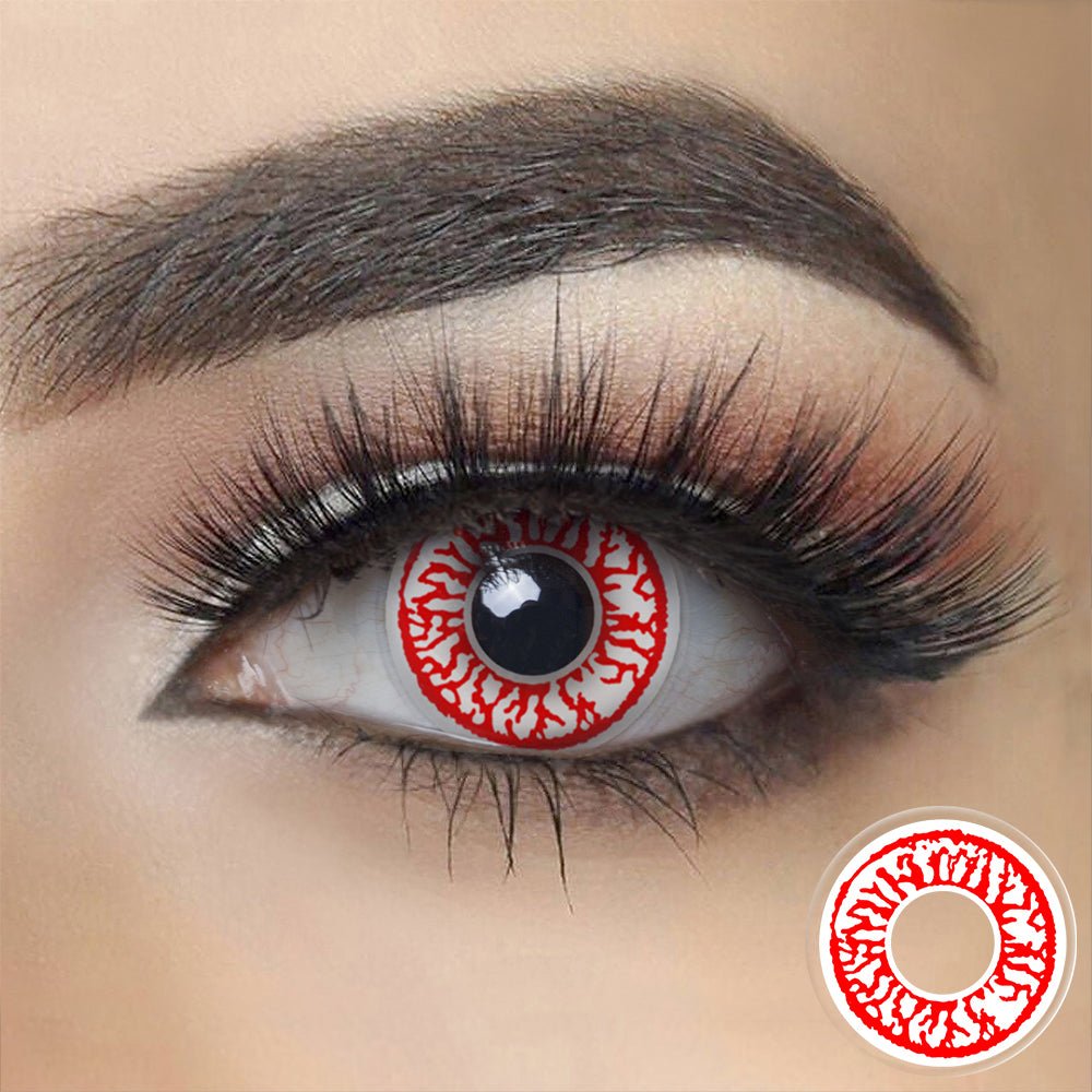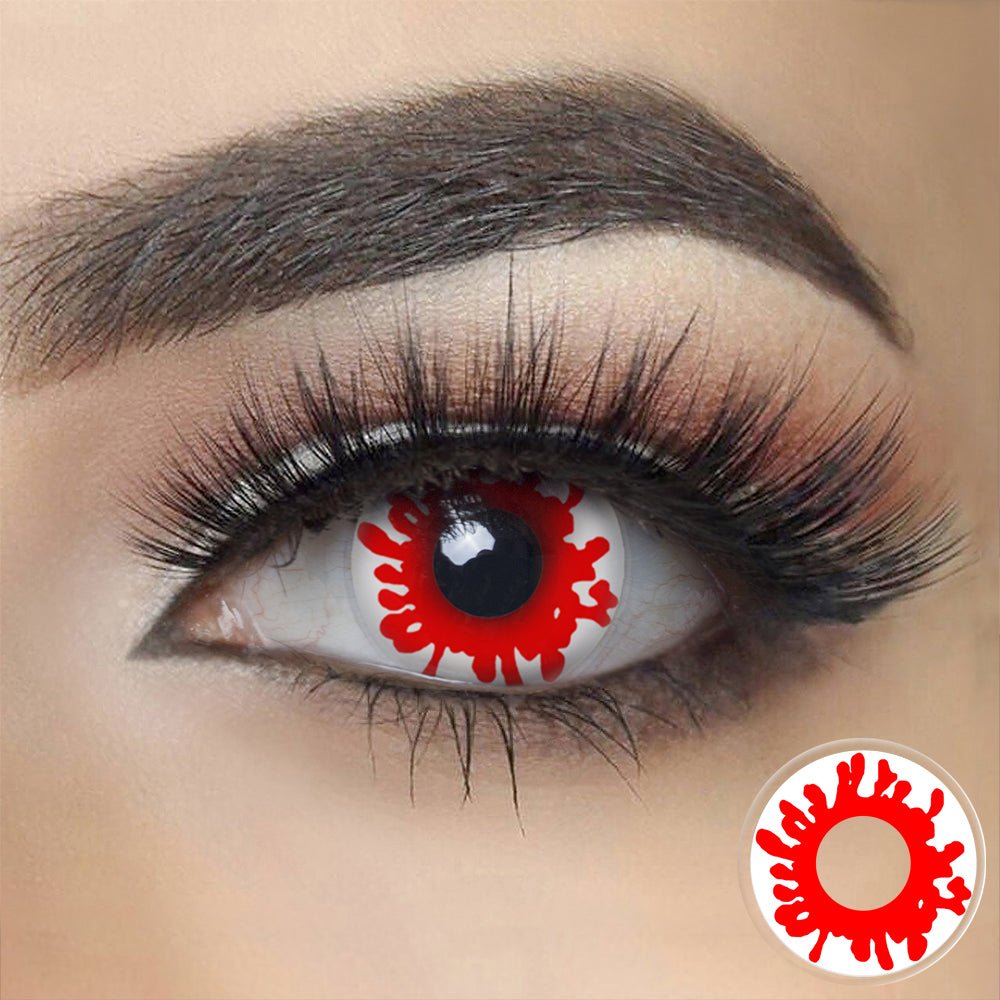 Create a gory look with these Crazy Blood Splat contact lenses. These crazy contacts feature a blood splat around your pupil that looks rather gruesome. They completely cover your natural eyes color, perfect for cosplay and Halloween.