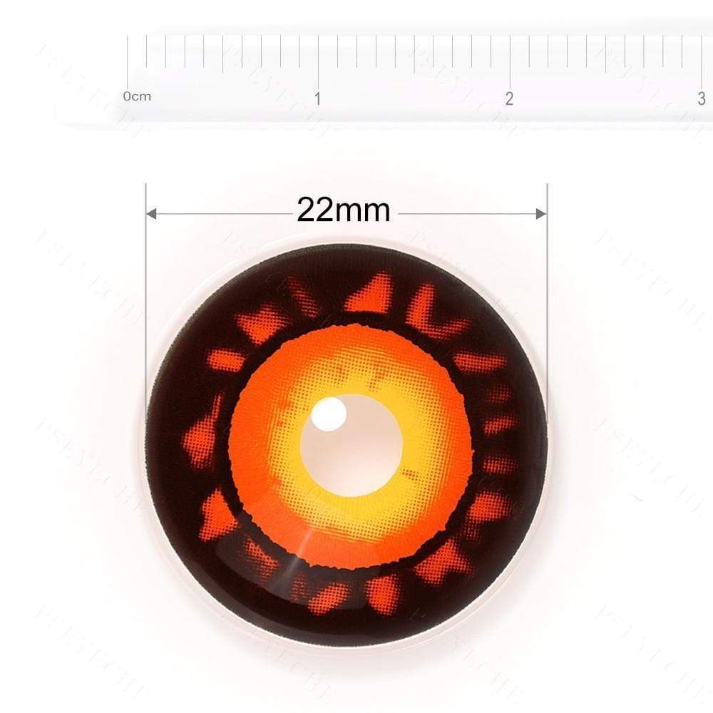 Let the hellfire burn in your eyes! With all-black background, the red outer circle is just like the flame in hell. The bright yellow block around your iris. These lenses will cover your sclera with a diameter of 22mm. These lenses make your eyes creepy and scary. Good for Halloween and Cosplay.