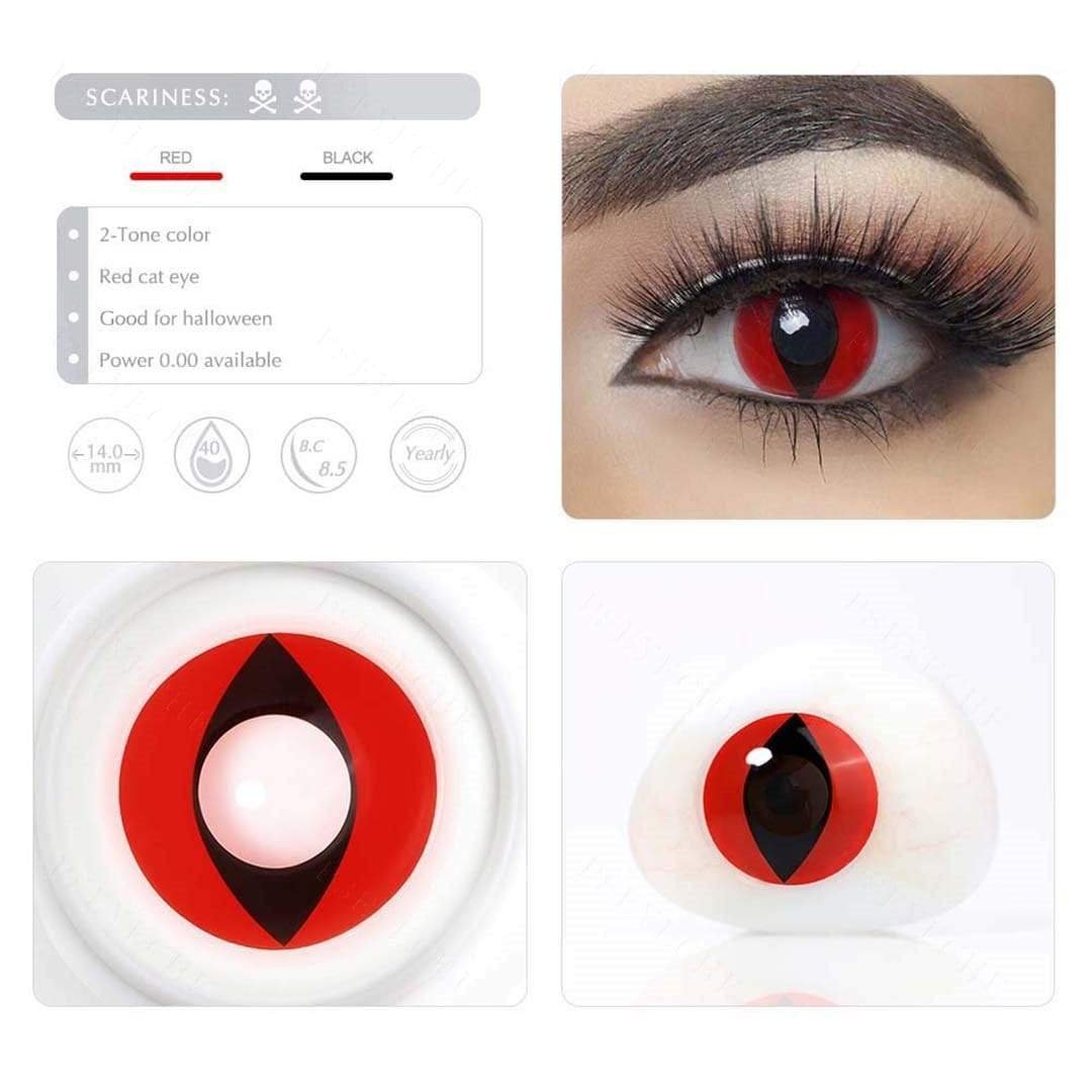 Red color is always reminiscent of demon or horror, Red Cat Eye contact lenses have a bright red background and a classic black vertical pupil. It completely transforms your eyes. These lenses can be used in a wide range of Halloween costumes and easy to create a freaky look.