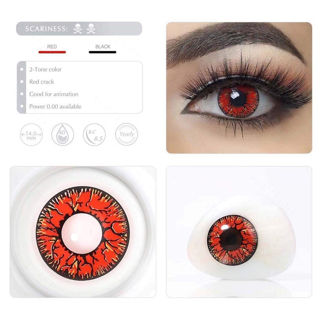 Designed with irregular black crack and blood-red background, these red crack Halloween contacts will add more wildness for your eyes. Release your wild side on any party night.