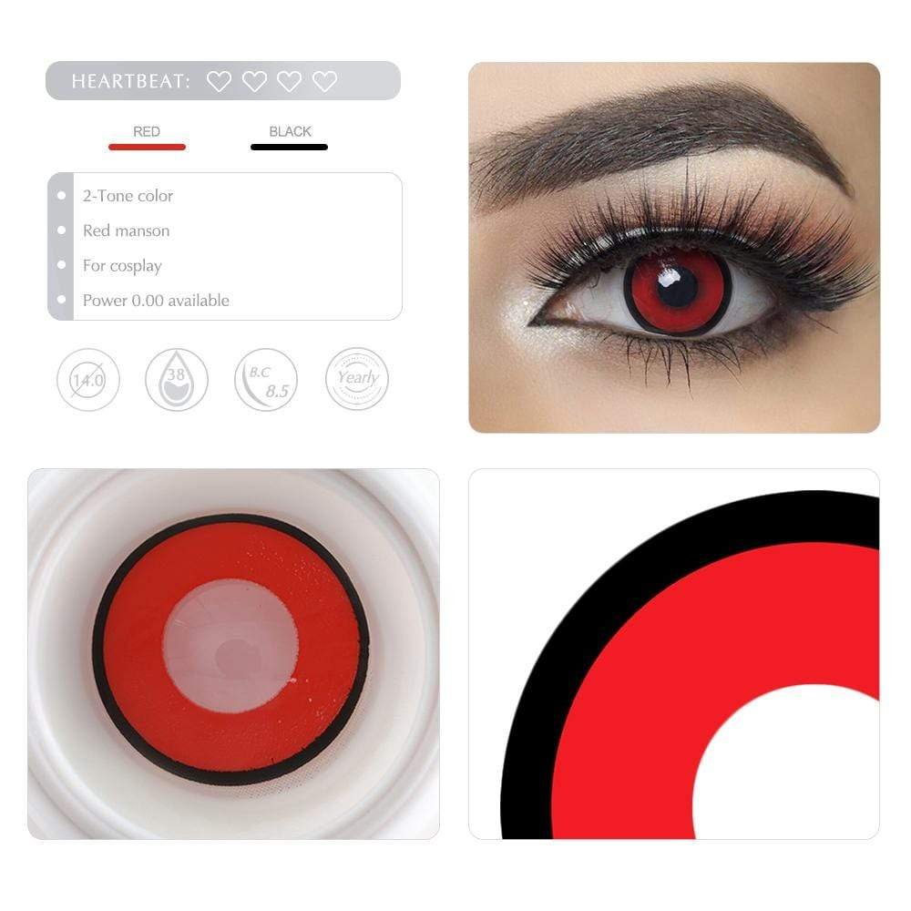 The Red Manson lenses feature the bold red color and black limbal ring, creating a scary looking. Wearing these contacts, you can have a costume as a zombie, demon, vampire, and so on. They are suitable for so many costumes or outfits that you should not miss the Red Manson.